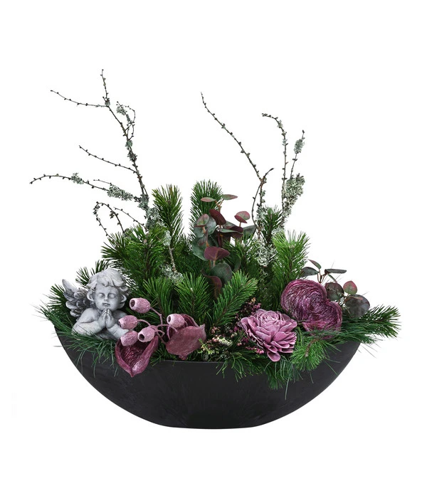 Neben dem wintergrünen Pflanzenset aus Blauschwingel, Knospenheide, Bergkiefer und dekorativen Fruchtständen wurde beim Grabgesteck Unvergessen im Vordergrund des Arrangements auch eine edle Rosenblüte platziert, dem wohl schönsten Sinnbild für die Liebe über den Tod hinaus. Der kleine betende Engel aus wetterfestem Kunststein wacht dagegen über den ewigen Schlaf der Verstorbenen und spendet den Trauernden Trost und Zuversicht, wenn sie das Grab besuchen. Dank der stattlichen Größe und der ovalen Form ist das Grabgesteck Unvergessen ein repräsentativer Winterschmuck auch für größere Gräber.