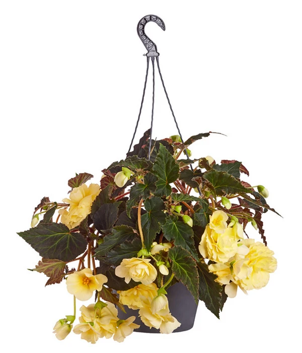 Geben Sie der Hängebegonie ‘Champagner‘ ein sonniges bis halbschattiges Plätzchen, wird sie sich als genügsamer Dauerblüher erweisen. Sogar in schattigen Lagen zeigt sie sich im vollen Blütenschmuck. Halten Sie das Substrat im Topf gleichmäßig feucht, vermeiden Sie aber Staunässe oder vollkommene Trockenheit. Anders als bei vielen anderen Blühpflanzen dürfen Sie mit den Düngergaben ruhig sparsam sein. Eine schwache, zweiwöchige Düngergabe ist vollkommen ausreichend, um die Hängebegonie ‘Champagner‘ in Blühlaune zu halten. Auch das Entfernen verblühter oder beschädigter Pflanzenteile regt die Bildung neuer Blüten an und schützt außerdem vor Pilzbefall.