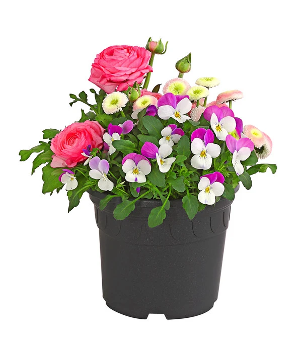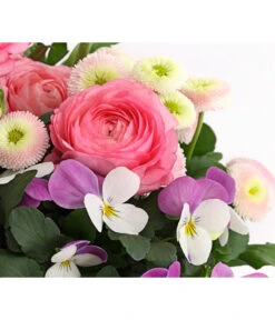 Jetzt wird es Zeit den Frühling einzuläuten! Sie wollen Ihren Gartentisch schmücken oder auch das Fensterbrett in Farbe tauchen? Dann greifen Sie doch zu unserem Frühlingsmix in Rosa. Hier finden Sie gleich drei Pflanzen zusammen in einem Topf. So brauchen Sie sich keine Gedanken mehr machen, welche Pflanzen Sie zusammen setzen können. Der Frühlingsmix enthält Ranunkeln, Gänseblümchen sowie Hornveilchen in zarten Rosatönen. Die perfekte Kombination für verspielte und romantische Arrangements. Lassen auch Sie sich von diesem tollen Pflanzenmix Frühjahr in Pastell verzaubern und lassen Sie den Frühling in Ihr Zuhause.