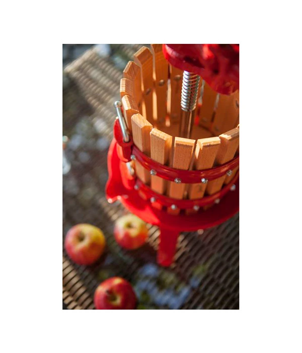 Wie die Miniaturausgabe einer großen, alten Weinkelter sieht diese Obst- und Weinpresse aus. Sie benötigt keinen Elektroanschluss, sondern wird von Hand bedient. In einer Gesenkschmiede wurde das Becken gepresst und anschließend lackiert. Die verschraubte Spindel besteht aus rostfreiem Werkstoff und der Presskorb aus abgelagertem Buchenholz. 6 Liter Obst und Früchte fasst der Presskorb. Hartes Kernobst sollten Sie vorher zerkleinern, um einen leichteren und effizienteren Pressvorgang zu garantieren. Drei feste Füße sorgen für wackelfreien Stand und die verwendeten Materialien ermöglichen eine leichte Reinigung. Die farbliche Dreiklang aus lackiertem Metall, rostfreiem Stahl und Naturholz macht dieses Werkzeug zu einem echten Blickfang.