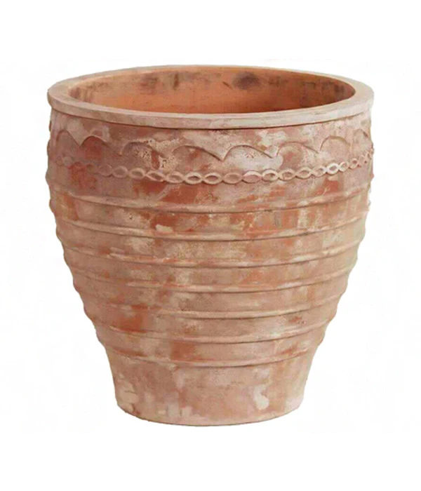 Bei jedem Blick auf diesen Topf sieht man vornehme römische Villen mit den typischen Innenhöfen voller schöner Terrakotta-Gefäße vor seinem geistigen Auge und ist sicher, dass sich unser Terrakotta-Topf Perugia schon damals unerkannt in die Reihen der edlen, antiken Vorgänger hätte einordnen können. Oder sehen Sie mehr die verwinkelten Städtchen rund ums Mittelmeer, wo Töpfe wie unser Terrakotta-Topf Perugia auf jeder Treppe, jedem Fenstersims eine Pflanze beherbergen? Welche Bilder auch immer in Ihrer Fantasie entstehen, genießen Sie einfach das faszinierende mediterrane Flair, das dieser Terrakotta-Topf Perugia überall verbreitet, wo Sie ihn platzieren. Von der Meisterschaft des Künstlers erzählt die vollendete Formgebung ebenso wie die feinen Ornamente im antiken Stil, die edle Patina unterstreicht noch die elegante Ausstrahlung dieses Klassikers.