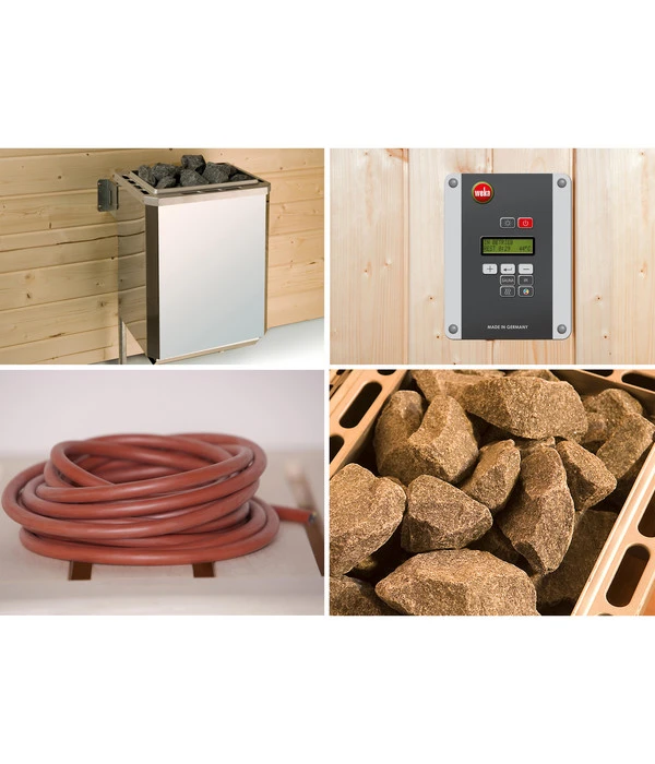 Was gibt es Schöneres, als sich an einem freien Wochenende oder nach einem langen Tag in die eigene Sauna zu begeben und so richtig zu entspannen? Fraglos trägt das optimale Equipment zu einer angenehmen Zeit bei. Mit dem Saunaofenset 2 liefert Ihnen Weka eine perfekte Möglichkeit, um individuelle Erholung zu genießen und frische Kräfte für kommende Aufgaben zu sammeln. Das Set besteht aus Saunasteinen, einer digitalen Steuerung im zeitlosen Design, einem Anschlusskabel, dem benötigten Montagematerial und einer präzisen Aufbauanleitung.