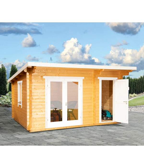 16,3 m², 44 mm Wandbohlen, Pultdach, Echtverglasung