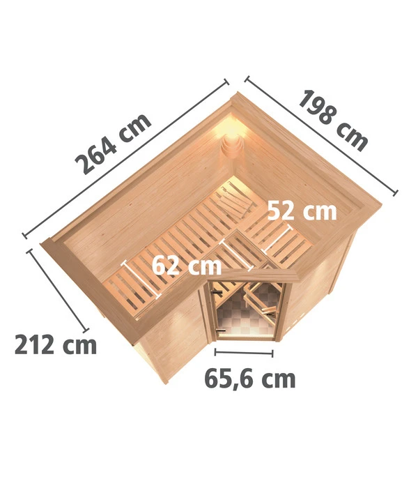 Sie erleben jeden Saunagang als Wohltat für Kopf und Körper, haben aber keine Lust mehr, mit lauter Fremden auf engstem Raum zu schwitzen? Dann ist eine eigene Sauna die Lösung, in der Sie sich nur mit der Familie oder guten Freunden die entspannende Auszeit beim gesunden Schwitzen gönnen. Eine eigene Sauna ist ein unbezahlbarer Luxus? Das muss nicht sein, wie wir Ihnen mit der Wolff Finnhaus Innensauna Basic Lisias beweisen möchten. Diese Sauna ist, wie im Namen schon andeutet, ein Basismodell, das Ihnen aber alles bietet, was Sie für einen gelungenen Saunaabend brauchen. Und das in der seit Jahrzehnten bewährten Material- und Verarbeitungsqualität von Wolff Finnhaus. Dank dem raffinierten Eckeinstieg bietet Ihnen die Sauna erstaunlich viel Platz im Inneren, braucht aber nur 4 m² Platz im Haus. Bestellen Sie gleich die Wolff Finnhaus Innensauna Basic Lisias und freuen sich schon darauf, wie Sie bald ganz privat saunieren!
